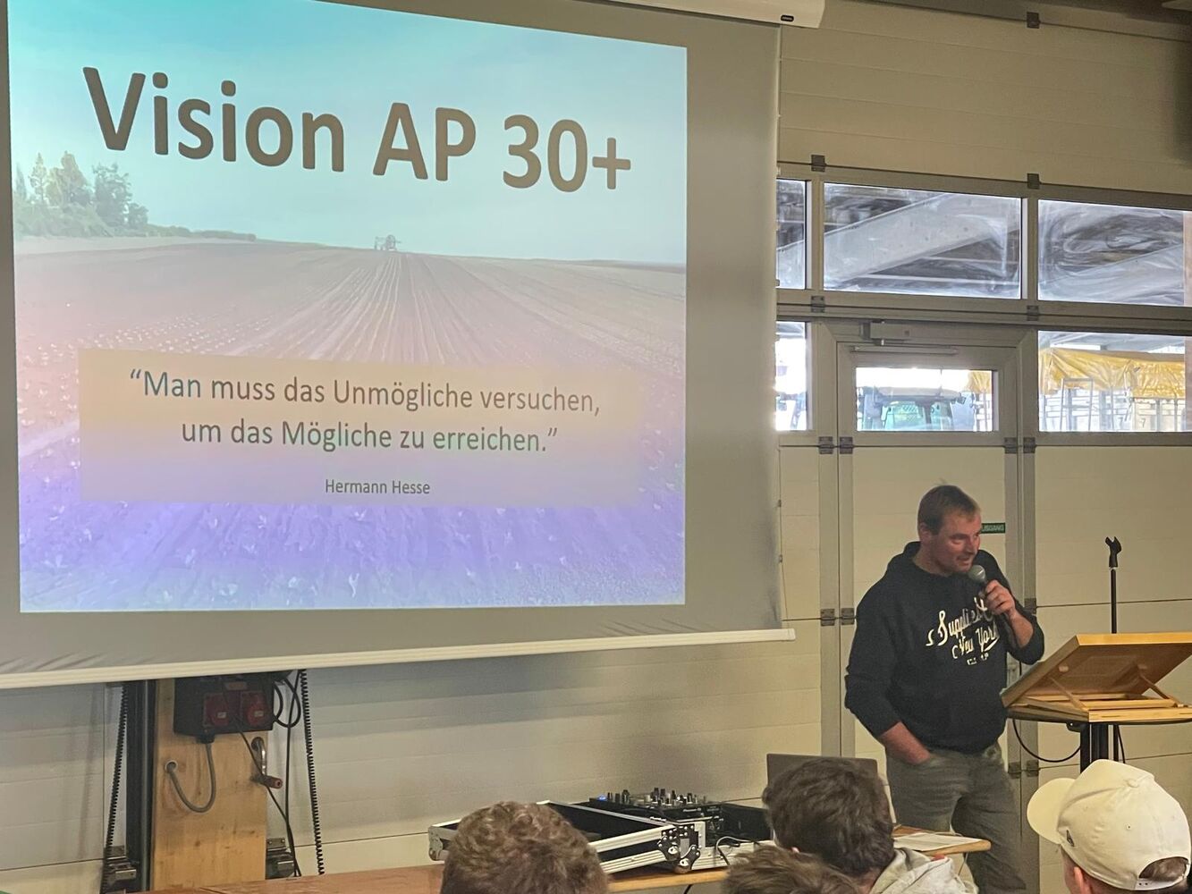 L'agriculteur Jürg Haas, originaire de Messen dans le canton de Soleure, a présenté la PA 30+ du point de vue de l'agriculture productive. Au lieu de se tourner vers l'avenir, l'administration veut introduire toujours plus de prescriptions et de réglementations incohérentes. Il faut s'y opposer fermement, car nous, agricultrices et agriculteurs, assumons nos responsabilités. Nous avons besoin d'un changement de système cohérent. Après des années d'écologisation de notre agriculture, nous avons besoin, avec la nouvelle PA 30+, d'instruments adaptés au marché et axés sur les producteurs, afin de garantir à l'avenir notre sécurité d'approvisionnement conformément au mandat de production. Pour une agriculture moderne, il est impératif de supprimer les divers programmes inutiles de les remplacer par des contributions à l'efficacité, calculées en francs par tonne de récolte valorisable. Nos familles paysannes veulent continuer à s'engager pour une alimentation durable et sûre de la population. En effet, rares sont les professions qui ont un lien aussi fort avec la nature et les animaux. Nous voulons tous nous engager en tant qu'entreprises indépendantes et préserver notre autonomie entrepreneuriale.
