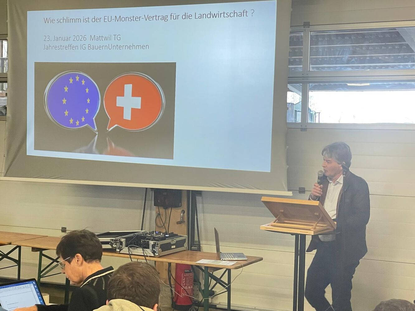 Le conseiller national Martin Haab, président de l'Union des paysans zurichois, a exprimé avec clarté le paquet « d’accord entre la Suisse et l'UE du point de vue de l'agriculture ». En cas d’acceptation de cet accord de soumission, la structure agricole suisse, la diversité paysanne et les normes élevées seraient affaiblies, voire vidées de leur substance. Le paquet d’accords prévoit en effet une centralisation accrue, ainsi que de nouvelles réglementations et des contrôles supplémentaires. Il est donc de continuer à défendre une agriculture productive, qui s’appuie sur les technologies les plus modernes pour produire des denrées alimentaires en Suisse, et de promouvoir une politique agricole et alimentaire entrepreneuriale. C'est la seule manière d'améliorer en permanence nos méthodes de production et de transformation afin de répondre aux attentes des consommateurs en matière d'aliments durables et sains et de garantir à long terme une création de valeur agricole positive.