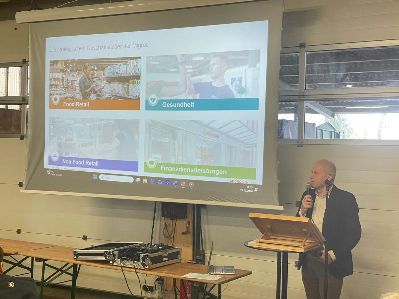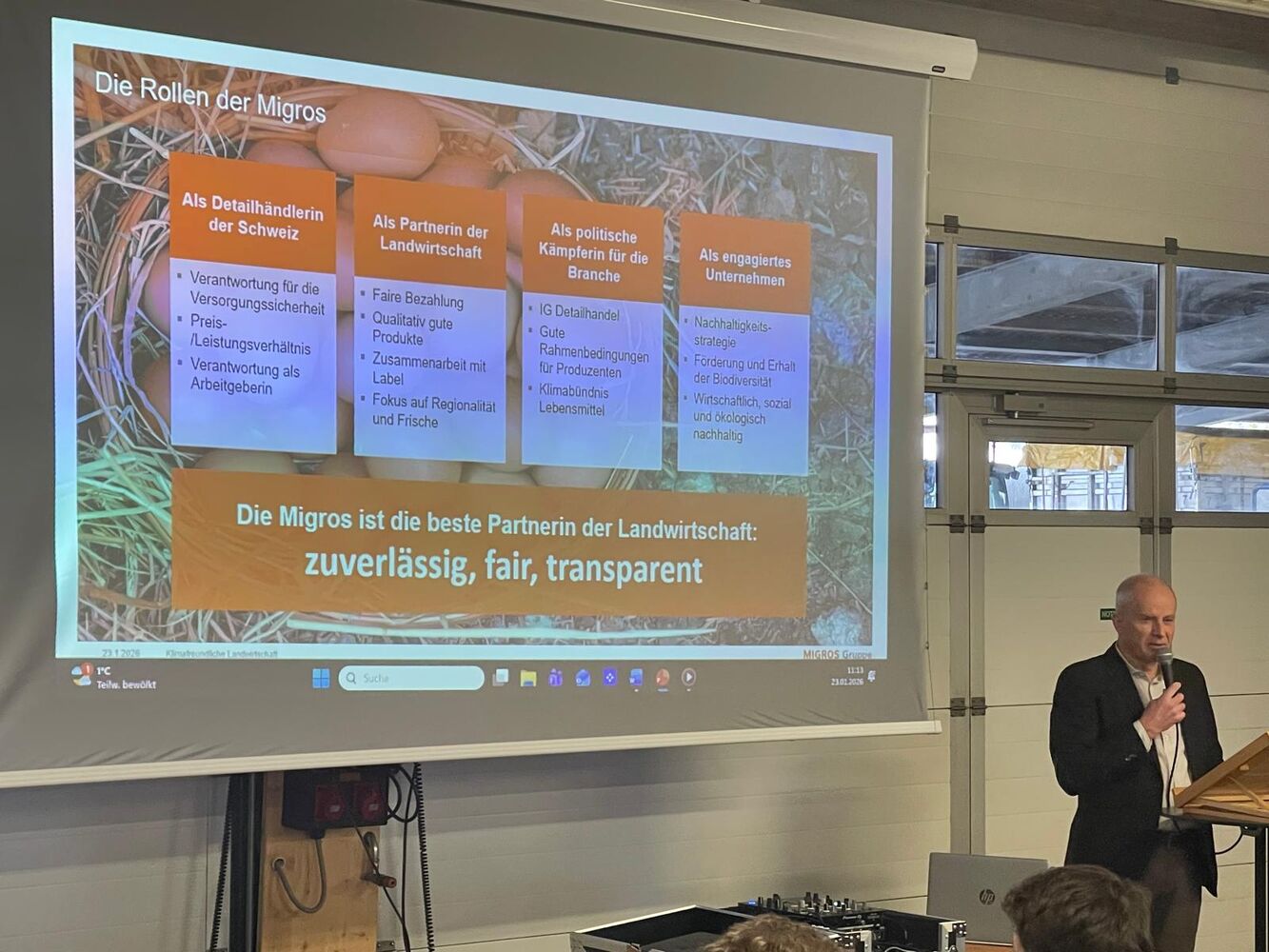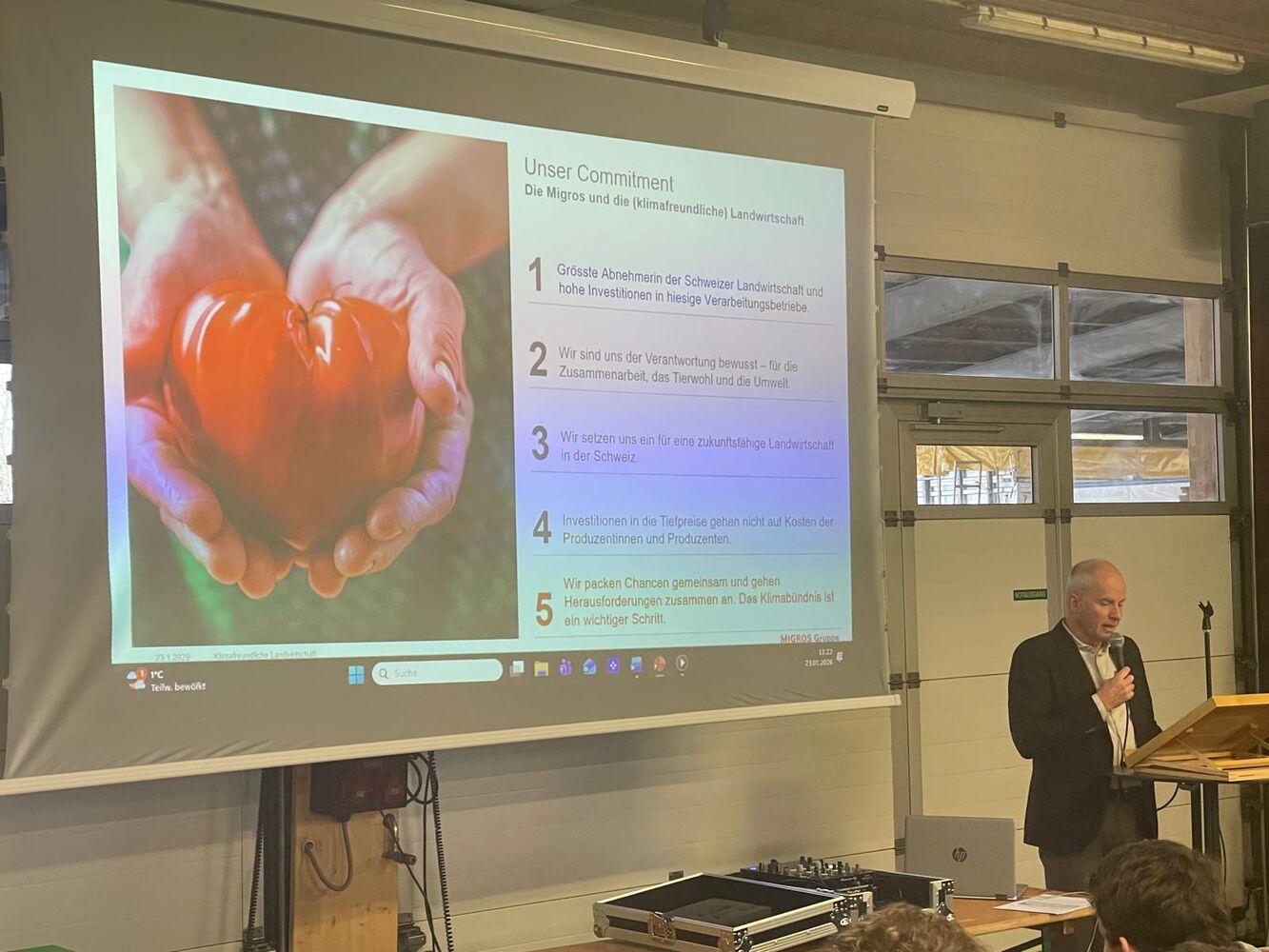 Sur l'exploitation agricole de Daniel Haffa à Mattwil, dans le canton de Thurgovie, le président Samuel Guggisberg a présenté, devant une centaine de personnes intéressées, les défis actuels de l'agriculture auxquels est confrontée l’agriculture. Jürg Maurer, responsable de la politique économique à la Fédération des coopératives Migros, a ensuite exposé les objectifs de l'Alliance climatique pour l'agriculture, fondée en 2025 en collaboration avec les plus grands détaillants. Ceux-ci visent à réduire les émissions de gaz à effet de serre à zéro net, grâce à la mise en œuvre de mesures efficaces favorisant des méthodes agricoles holistiques et durables, sans diminution de la production locale. Les priorités comprennent également l'introduction d'un échange de données standardisé tout au long de la chaîne de valeur, ainsi que le développement d'un modèle de financement garantissant l'origine et l'utilisation des fonds, afin de prévenir les distorsions du marché. Il s’agit de veiller à ce que les prestations fournies par les producteurs soient rémunérées par les acheteurs tels que les transformateurs, le commerce et l'industrie.